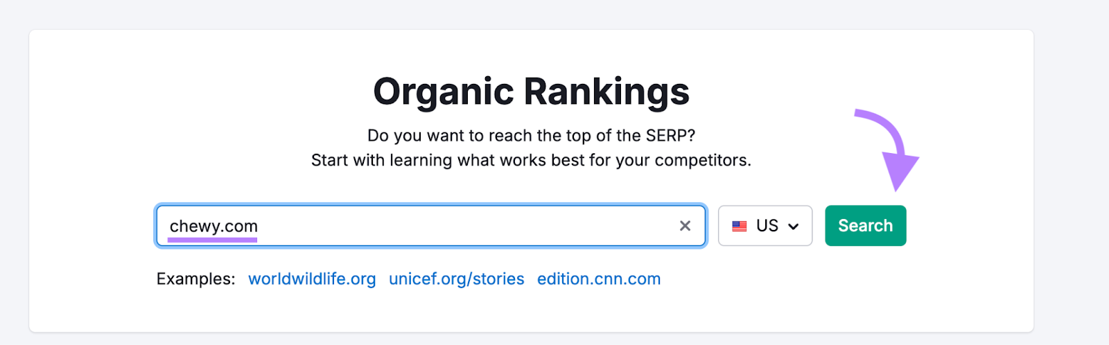 - Organic Rankings: Enter a domain or URL to see what keywords it ranks for