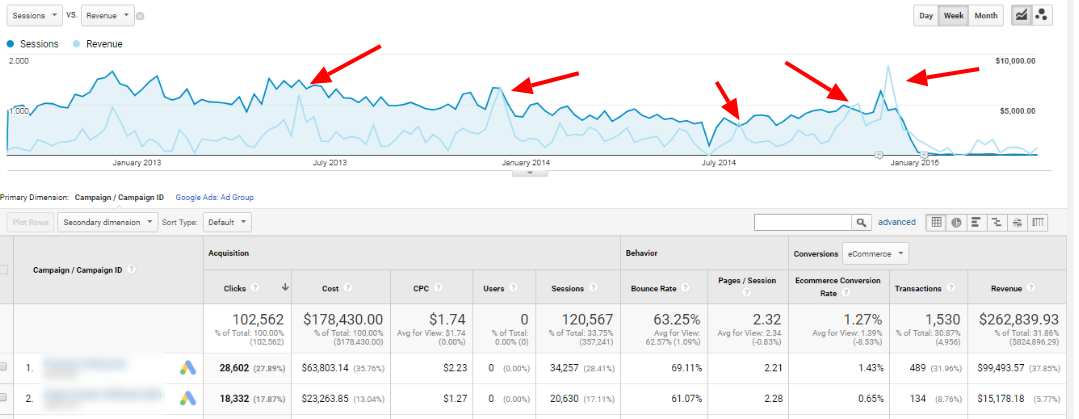 Google Adwords campaign performance data for one of our client’s websiteBy determining the average of multiple instances when your Ad campaigns were most successful in the past, in terms of impressions, your Adwords tool will point out your seasonal events explicitly. Recurring events like this are a clear indication of seasonal events taking place specifically in your business niche.