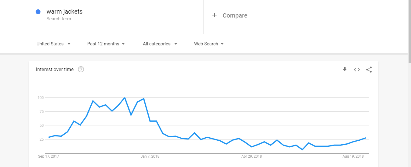 Warm jackets were searched the most in the months of November and December which is the peak winter season: