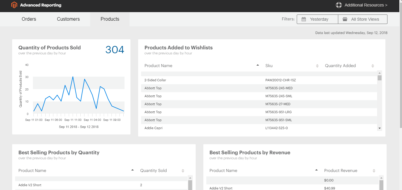 Product performance reports provided by Magento under Advanced reporting